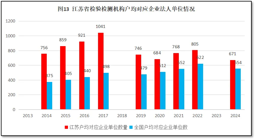 江苏作为经济大省,企业单位数量众多,以2024年度的统计数据计,江苏地区企业单位数量超过273万个,位居全国第2位。江苏省检验检测机构户均对应的企业法人单位数量为671个,比全国平均水平554个高出117个,检验检测机构户均对应企业法人单位数量排名全国第8(较2023年下降2位次)。这说明江苏地区检验检测机构的市场空间很大,可拓展的客户资源很多,可能由于统计口径导致的数据误差,江苏省检验检测机构户均对应企业法人单位数量出现一定程度下降。过去12年江苏地区检验检测机构户均对应企业法人单位数量与全国情况的比较如图13所示。