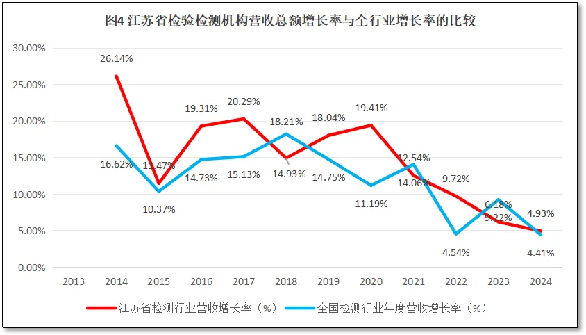 比较江苏省检验检测行业年度营收总额增长率与全国检验检测行业年度营收总额增长率,如图4所示。