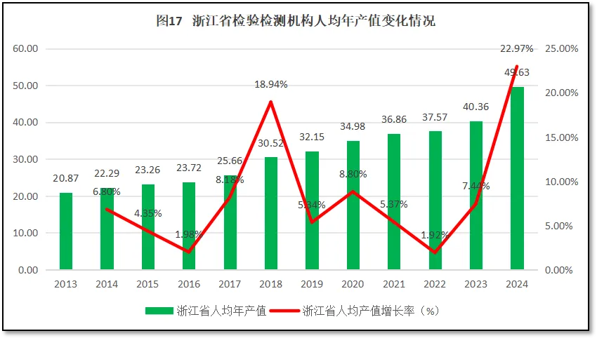 由图20可见,浙江省检验检测机构户均营业收入持续保持增长,2024年户均营业收入是2013年的3.24倍,12年来年均增长11.7%。从增长率的曲线来看,除了头两年数据误差大显得增长率很高之外,在2018年和2020年浙江省户均年产值增长率出现两个小的峰值。2021-2023年,浙江省检验检测机构户均年产值逐步走低,但2024年出现巨大反弹,户均年产值增长率达到27.64%,为2015年以来的最高值。