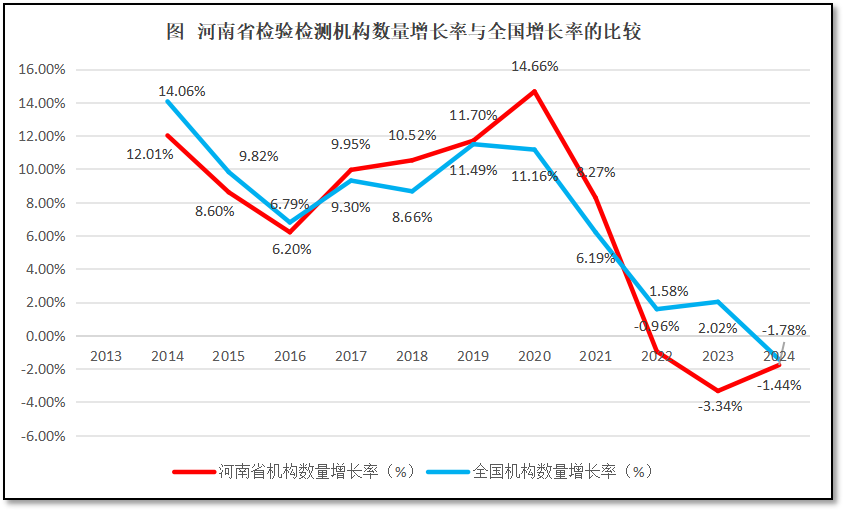 河南省检验检测机构数量增长率与全国检验检测机构数量的增长率进行比较,如图2所示。