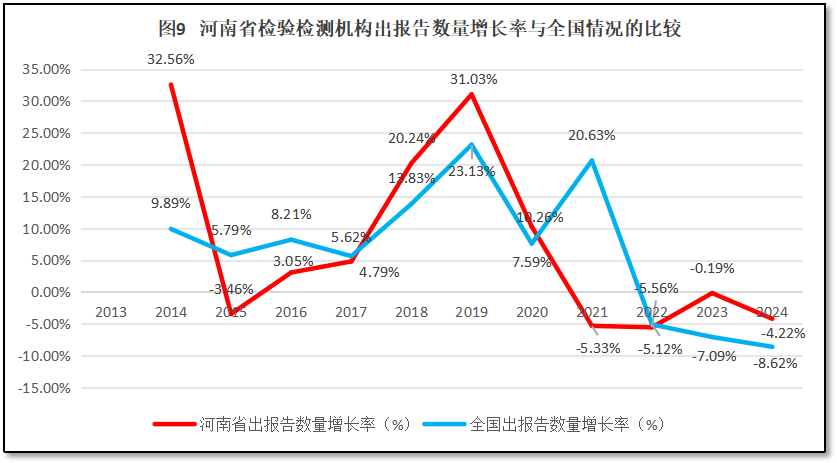 河南省检验检测机构出具报告数量的增长率与全国检验检测机构出具报告增长率的比较,如图9所示。